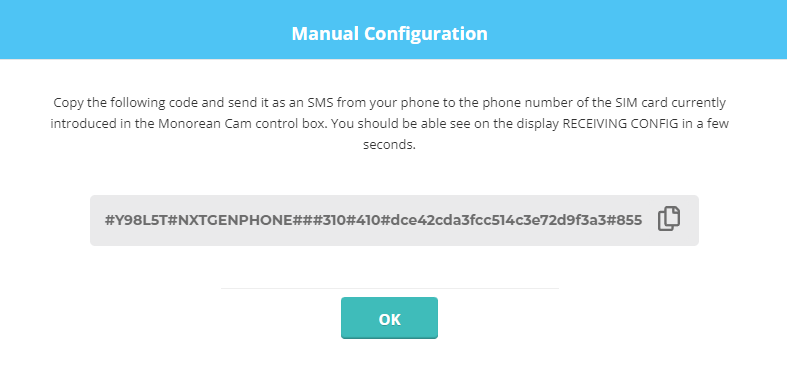 Once clicked, you will see a pop-up window which contains a backup code. Copy the code and send it as an SMS from your phone to the phone number associated with the SIM card inserted in the Monorean Cam Control Box: