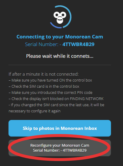 Monorean Inbox will try to connect to your Monorean Cam, but since you have inserted a new SIM card it will not succeed. Click the Reconfigure your Monorean Cam button and you will automatically be directed to the set-up process.