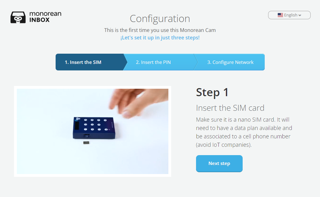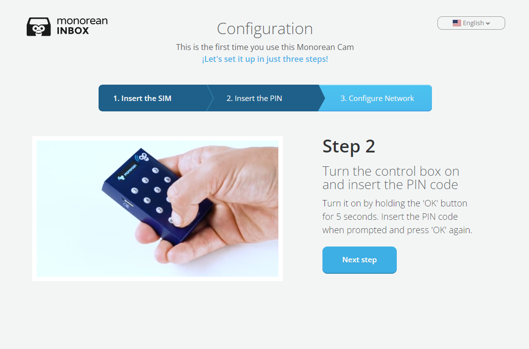 If you want to use a new SIM card, you will need to reconfigure your Monorean Cam. Insert your new SIM card into the Control Box, turn it on and access the set-up process. You can access it in two ways: