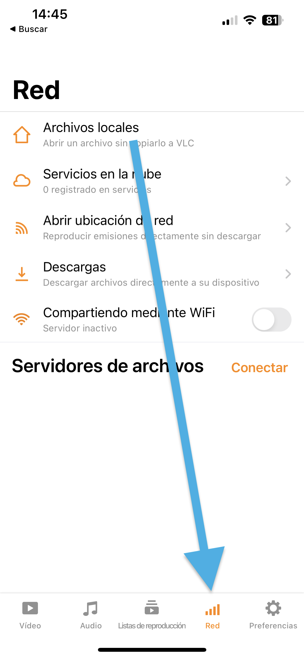En tu móvil, abre la aplicación VLC que acabas de descargar y busca el botón ‘Red’ en la parte inferior.