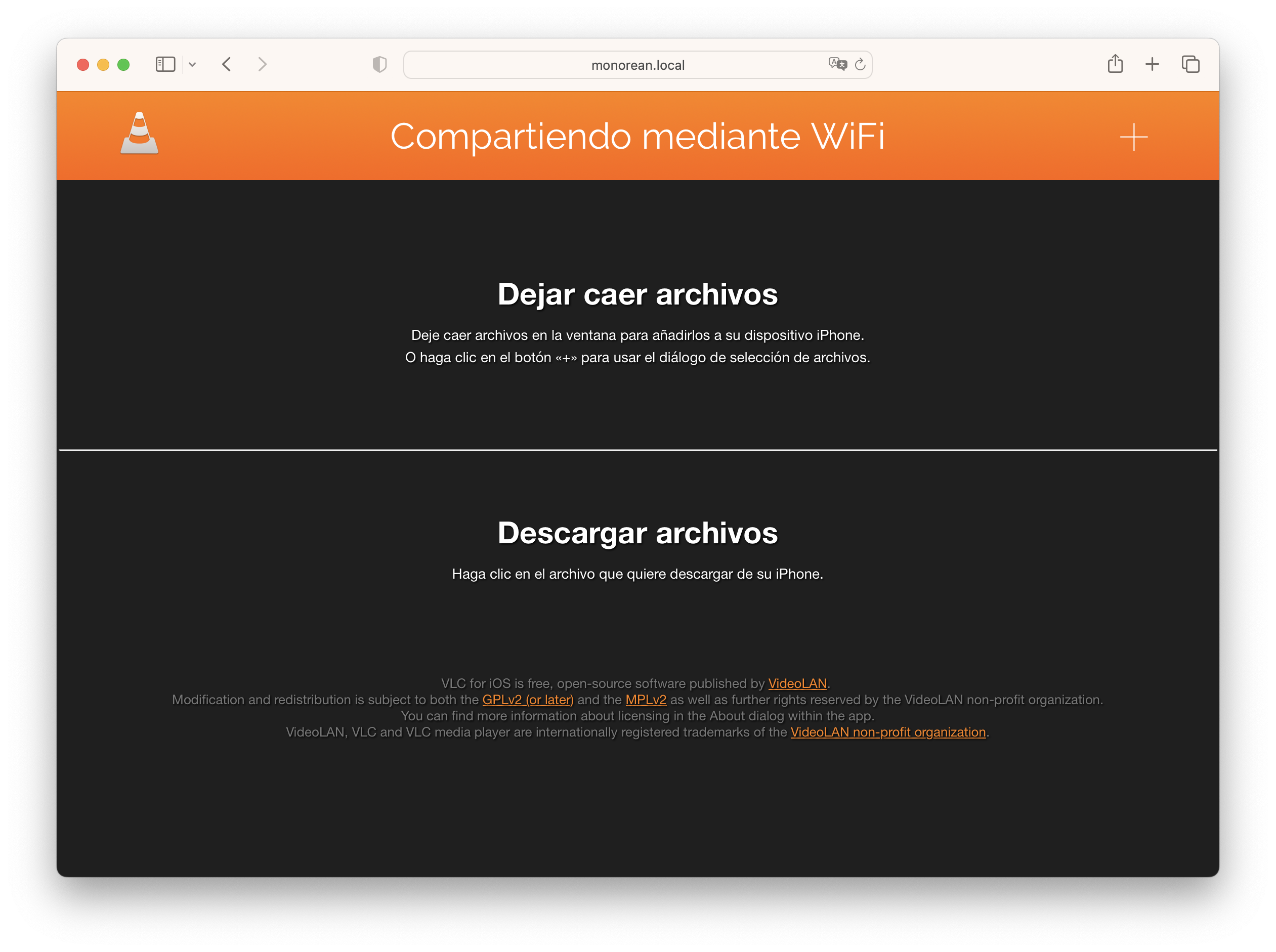 Desde tu ordenador y sin cerrar la aplicación VLC, deberás de acceder a una de las dos direcciones que has anotado previamente. Ambas llevan al mismo punto. Prueba la primera y en caso de que no funcione, prueba la segunda. En nuestro caso, http://monorean.local ha funcionado a la primera. De no haber sido así, probaríamos con http://192.168.1.129