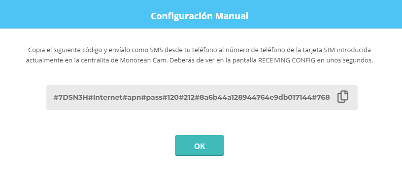 Una vez presionado, podrás ver una ventana emergente donde encontrarás un código. Deberás copiarlo y enviarlo como SMS desde tu teléfono al número de teléfono de la tarjeta SIM introducida actualmente en la centralita de Monorean Cam: